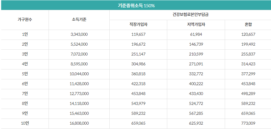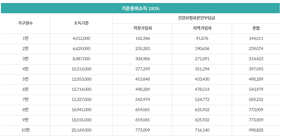 ▶ 위의 표는 기준 중위소득 100~180%까지 확인 가능합니다.