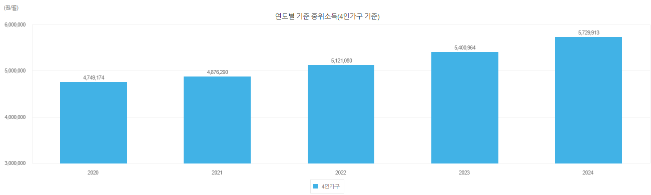 부모 2명, 미성년 자녀 2명이라고 했을 때 부부합산 소득이 5,729,913원이 되어야 '중간쯤 번다'라고 생각할 수 있습니다.