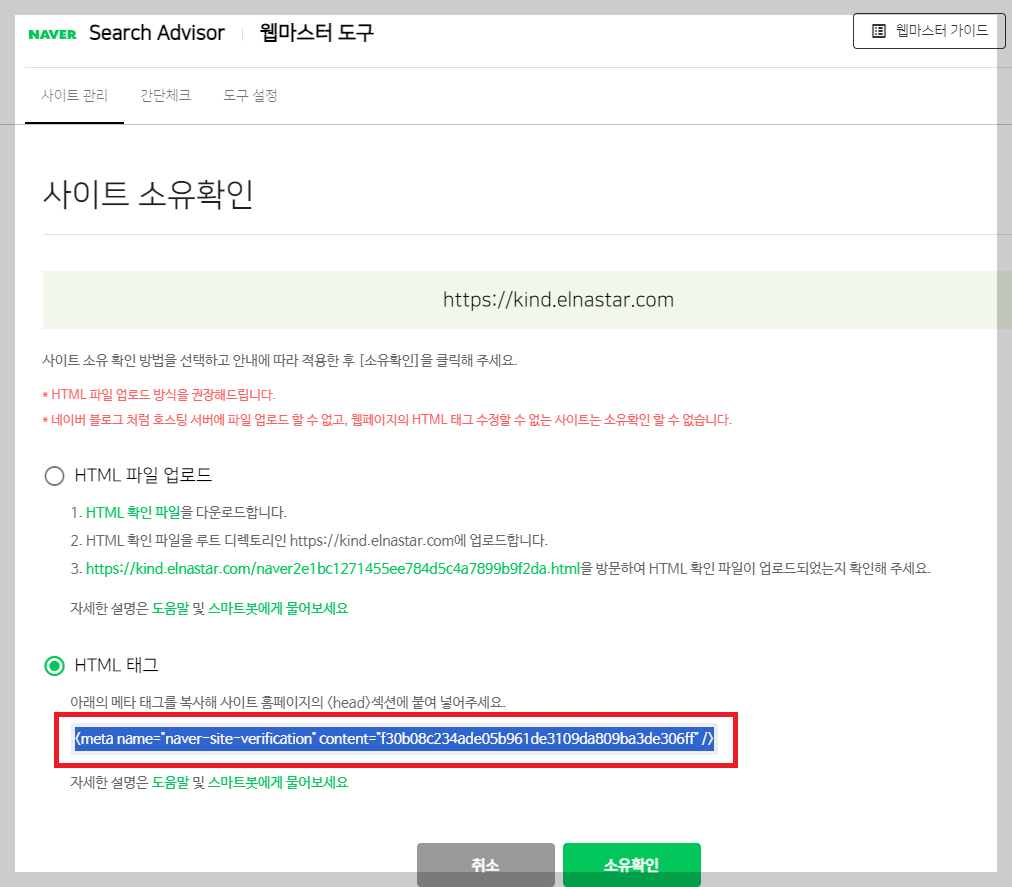 7. 사이트 소유 확인 완료.