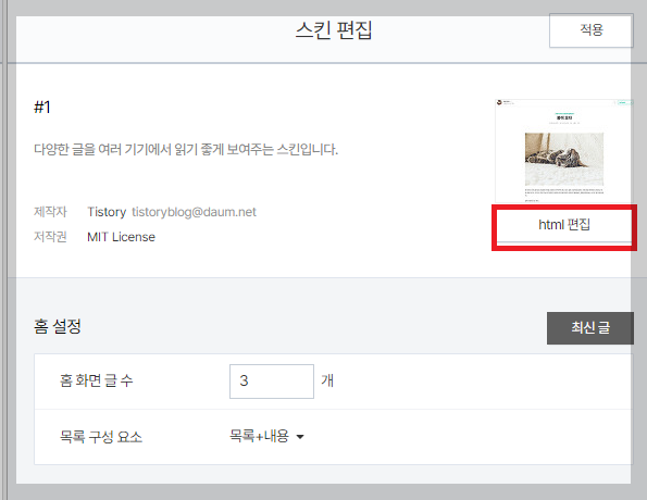 5. HTML편집을 누르고 <head> 아래에 복사한 태그를 붙여 넣고 <적용> 누릅니다.