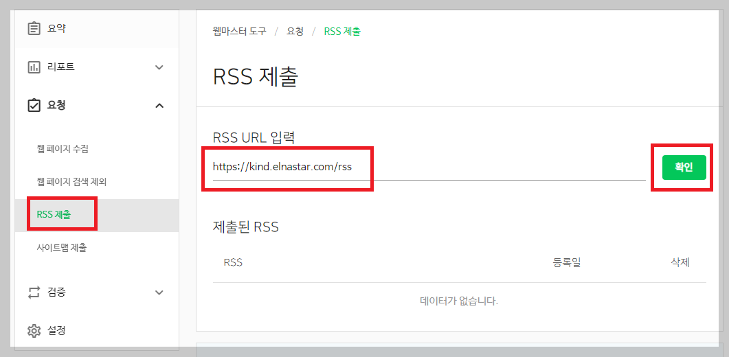 9. 요청 → RSS제출 → RSS URL입력란에 티스토리 블로그 주소를 넣고 '/rss'를 함께 넣어 입력합니다.