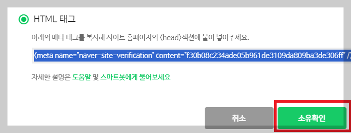 6. 네이버 서치어드바이저로 돌아가 <소유확인>을 클릭합니다.