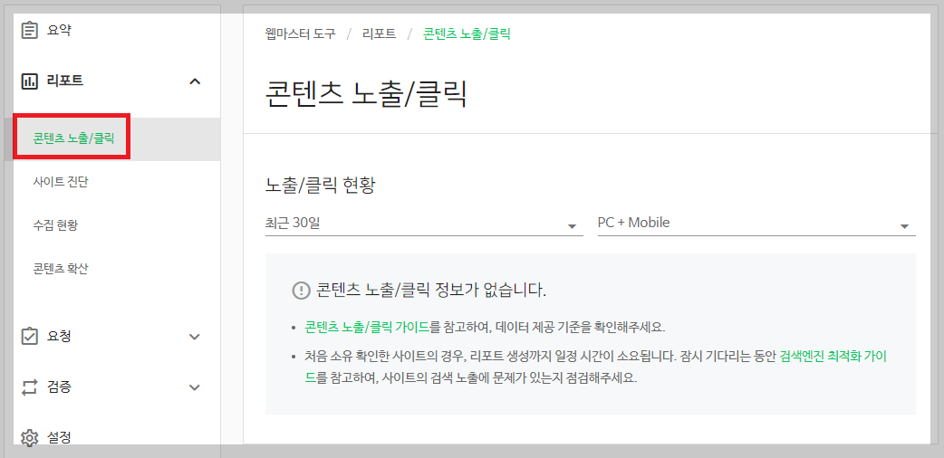 [리포트 → 콘텐츠 노출/클릭]에서 노출 현황을 그래프와 숫자로 보실 수 있습니다.