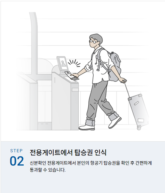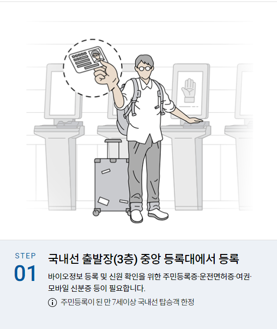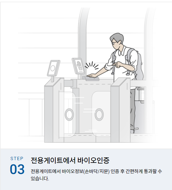 ▶ 비행기 탑승 전 본인 확인을 위해 신분증을 들고 긴 줄을 서서 기다리지 않고 빠른 수속을 할 수 있는 서비스로, 만 7세 이상 등록가능하며 위조가 불가능한 손바닥 정맥을 등록하여 본인 인증을 간편하게 하는 방법입니다.