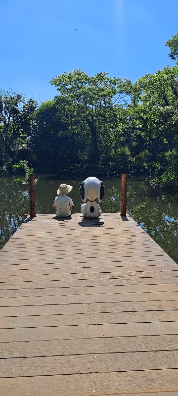 캐빈 앞 연못에서 스누피랑 나란히 앉아서 한 컷.