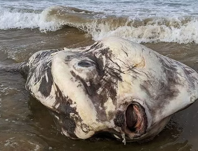 ▶ 죽은 개복치가 해변으로 밀려온 사진입니다. 한눈에 봐도 크기가 어마어마합니다.